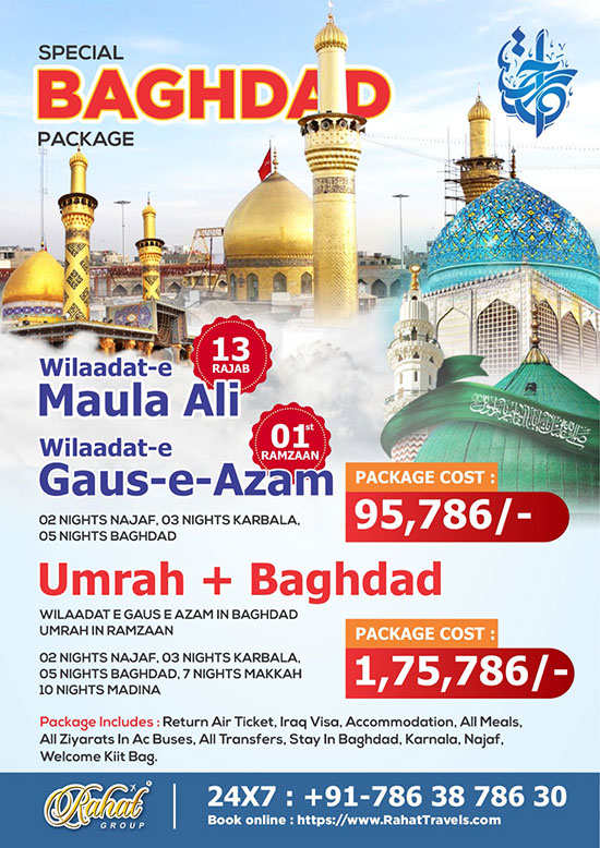 We are continuing to offer travel packages for a Baghdad Ziyarat throughout thes year. Baghdad is a beautiful city, my brothers and sisters. It is one that is replete with the undercurrents of our cultural heritage. The city, complete with its masjids, tombs and other holy sites, is a surviving testimonial to the greatness and diversity of Islamic Culture, for it was one of the commercial and intellectual capitals of the world at the time. It is a testimonial to our glorious past and a call to the future, one which urges to grow as humans and people.