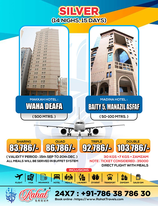 "This is Rahat Group's most popular package, offering a choice of three hotels in Makkah: Waha Deafa on Ajyad Street, Mather Jawar on Hijra Road in Misfala, and Tara Ajyad in the Bir Bareilla area. Each hotel is located in a different area, with Makkah hotels approximately 500 meters from the Haram and the Madina hotel just 200 meters away. This package provides flexibility in location while ensuring a comfortable stay close to key pilgrimage sites."