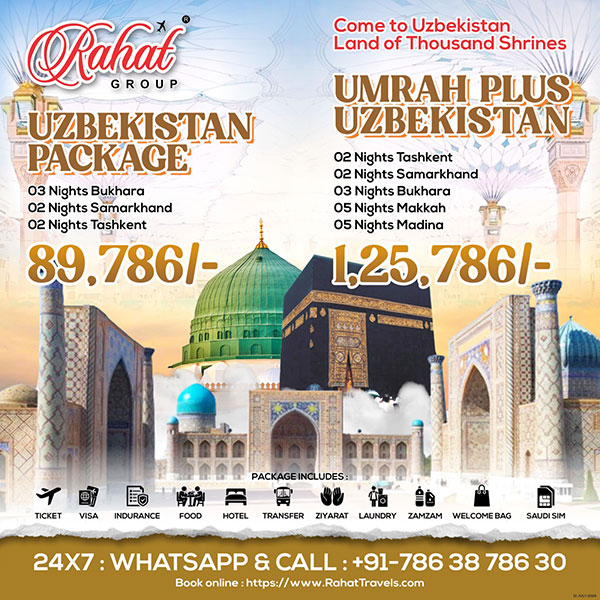 RAHAT GROUP offers regular tour packages to Uzbekistan, the "Land of a Thousand Shrines," a place of deep spiritual and historical significance. Uzbekistan, home to the Naqshbandi Silsila, is where some of the greatest scholars and saints of Islam originated, including Imam Bukhari. Our unique Umrah plus Uzbekistan package allows you to combine your spiritual journey with a visit to this sacred land. Explore the revered cities of Samarkand, Bukhara, and Tashkent, where the legacy of the Great Seven Sufis continues to inspire pilgrims and travelers alike. Discover the spiritual richness of Uzbekistan with RAHAT GROUP for a truly enlightening experience.